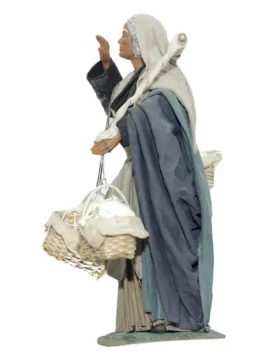 Donna che da la voce con cesti formaggi